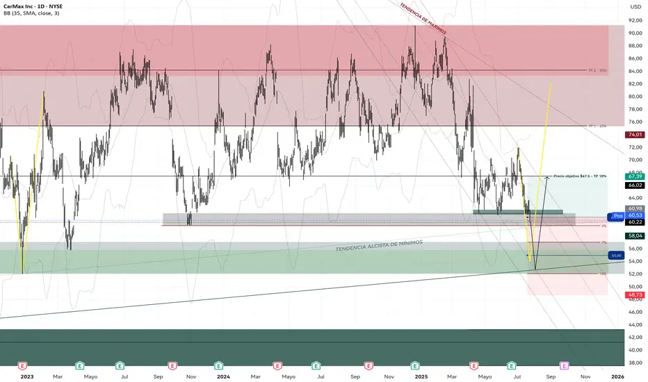 KMX se está acercando a la parte baja de la tendencia alcista, ha roto los mínimos diarios y podría experimentar una posible corrección del 15%.