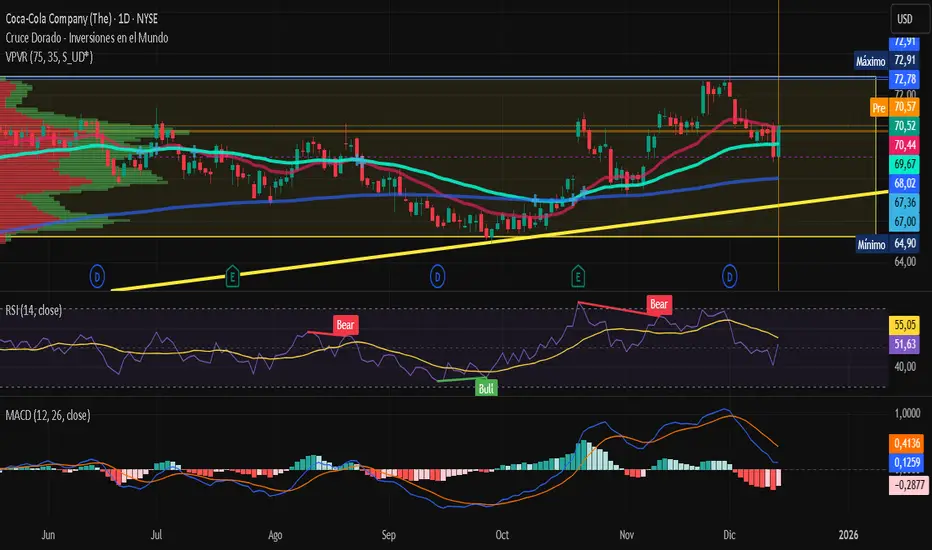 En términos de tendencia, Coca-Cola sigue siendo alcista en horizonte amplio, aunque 2024 y 2025 han estado marcados por un comportamiento lateral, típico de valores defensivos en entornos de incertidumbre macro y tipos elevados.