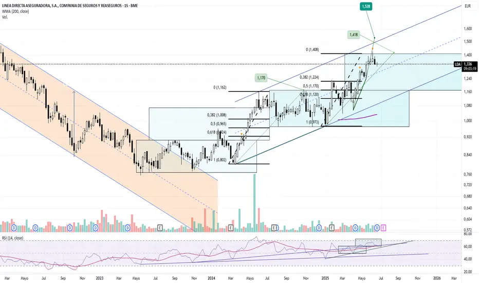 En diario gráfico y después de ajustar también el gráfico quedaría llegar a 1,458€ por doble suelo que activó el 10 de junio pero que se ha ido para abajo otra vez, a la espera de que como digo, pegue un pequeño impulso. Ahora mismo no esta sobrecomprada y el RSI parece que titubea por la zona media en diario. Si perdiera 1,326€ diría adiós a LDA.