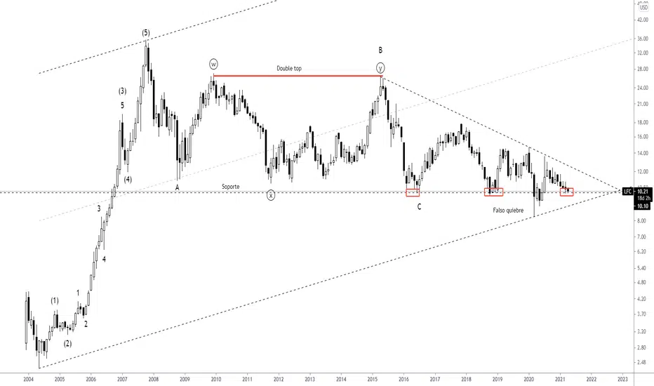 Desde el 2007 que inicia el movimiento correctivo en LFC, el activo se mantuvo por encima de los 10 usd. Se validó en tres oportunidades, 2016 / 2018 /2021. El año pasado hubo un falso quiebre que llegó a los 8.30 pero se recuperó en prácticamente tres meses.