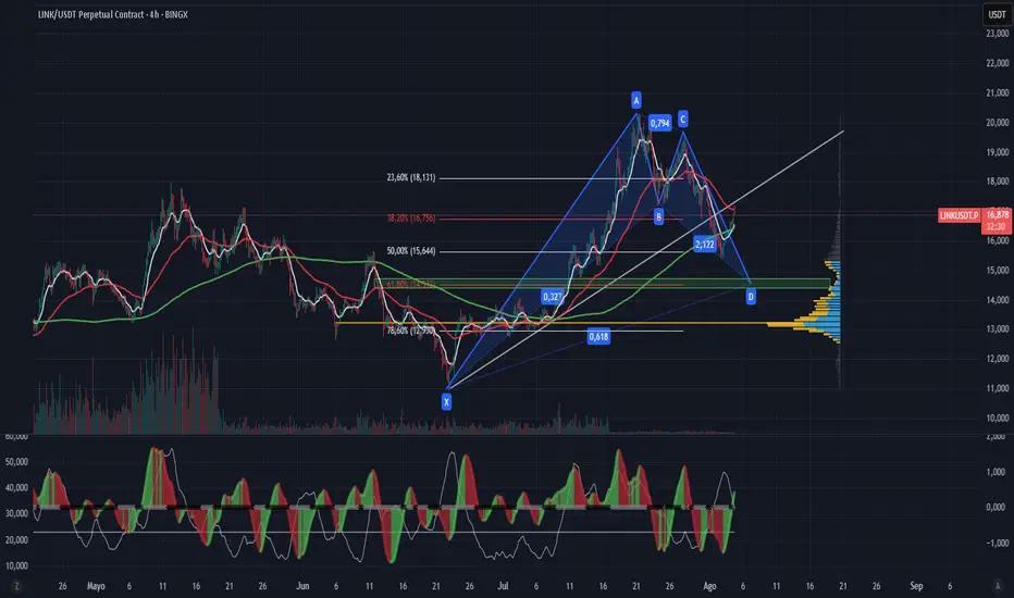Patron BAT, en 4H nos daria la continuacion del movimiento alcista y nos llevaria a +30. El soporte estaria en el rectangulo verde al rededor de los 14.5 per token. Coincide con el 0.618 fib del retroceso y con el punto 1.618 de la extension del punto C-D del patron armonico.