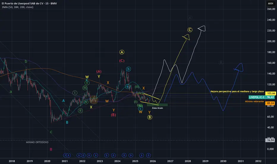 ESCENARIO 1 (el + alcista): La corrección de precios que inicia el 2 de abril del año 2024 ya terminó. Termina la "B" del "ABC" primario en color amarillo. Bajo este escenario, $85.24MXN fue nuestro precio más barato que nos dio el mercado durante este proceso. ¿Qué parámetros irán dando mayor confianza a esta hipótesis?