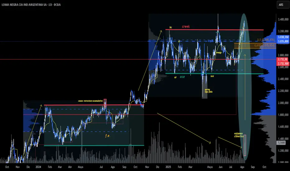 Retomando el seguimiento de LOMA, observamos una importante caída en el precio tras el reingreso al rango de la estructura de re-acumulación. El foco del análisis se centra en el comportamiento del volumen climático, elemento clave para interpretar la acción de los operadores con mayor peso en el mercado.