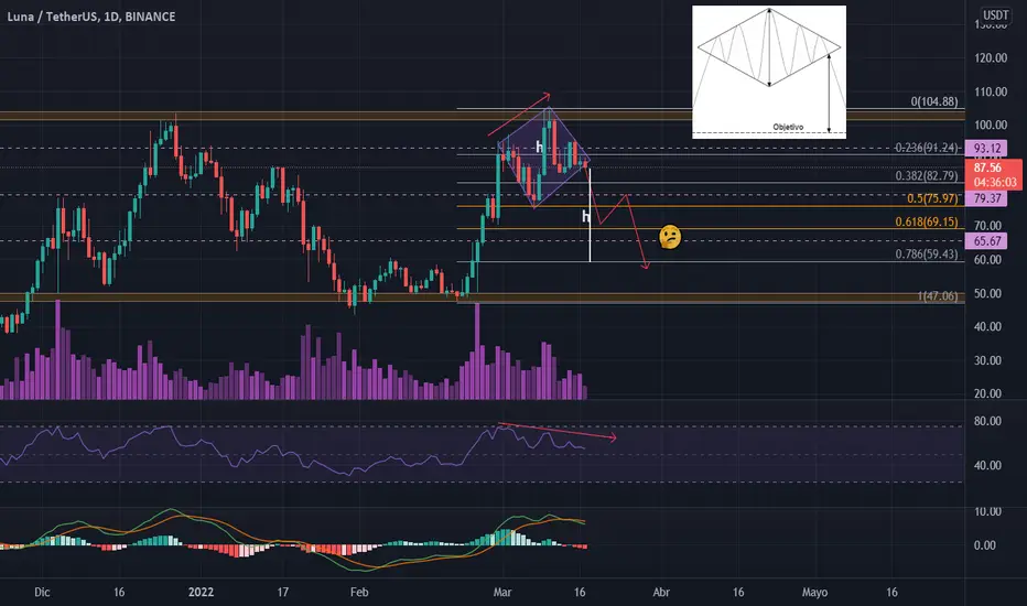 LUNA y veo que estaría respetando el máximo anterior. En este punto que ven ustedes?? Es un diamante de inversión de tendencia?? Pues es lo que esperaré unas velas en H4 para ver como resuelve.