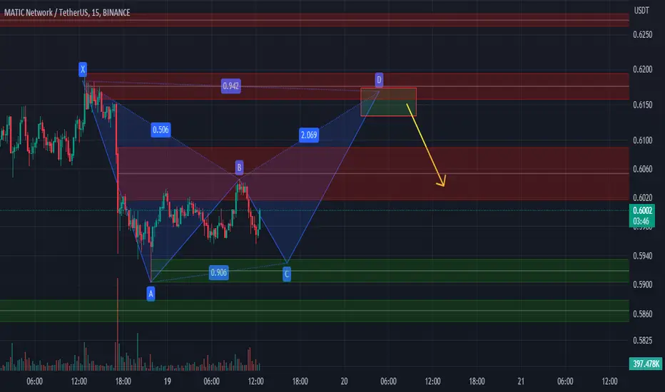 Buenas Gente, vamos a empezar a mirar Matic mas de cerca, despues de muchas lectura de su grafica elegimos matic como la criptomoneda que se mueve de una forma mas exacta dando patrones bien definidos. En este caso estammos gestionando un SHARK aunque el punto C puede que3dar aun m as abajo de lo que marcamos