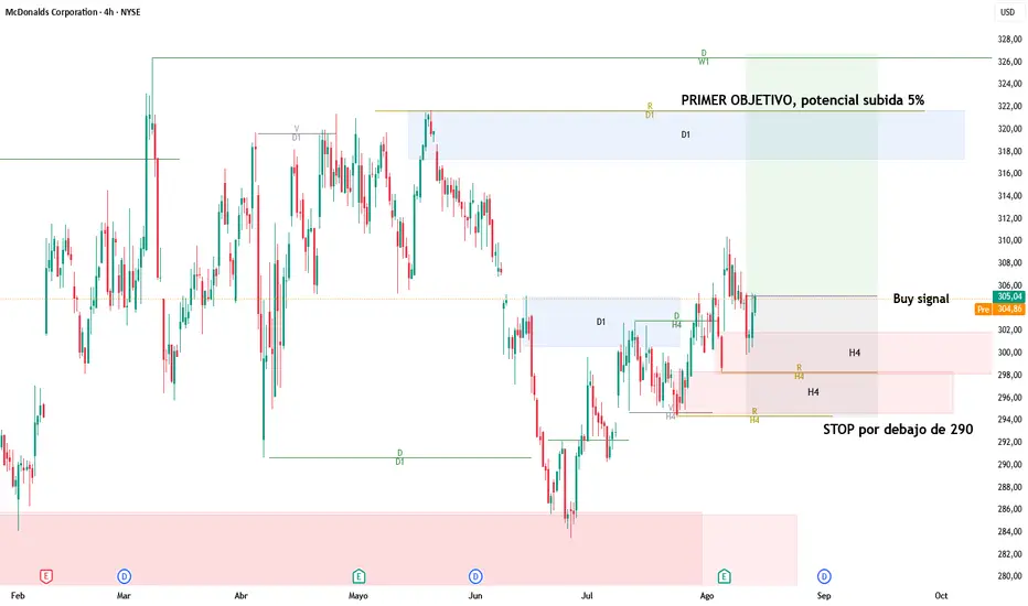 📈 Durante la sesión más reciente, el precio se movió en un rango aproximado de USD 301,40 a USD 305,31, una subida que hace pensar en una potencial entrada en compra, tras el rebote en las zonas de interés más cercanas.