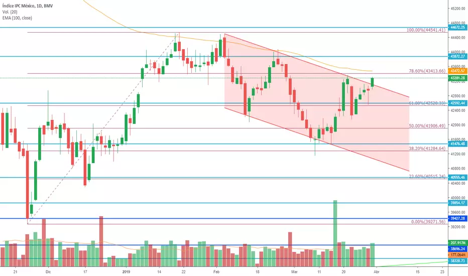 Ésta semana será clave para que el IPC ya que la anterior sesión rompió un canal bajista con un volumen ligeramente superior al promedio, de ser respetada ésta rotura la primer resistencia es la EMA de 100 periodos, la rotura de ésta EMA podría ser señal de confirmación para entrar largos y tener un TP en los 43.800 puntos