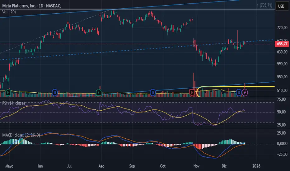 META, detenida en el tiempo, aburrida, lateralizando. De momento se encuentra en medio del canal alcista que venimos siguiendo.