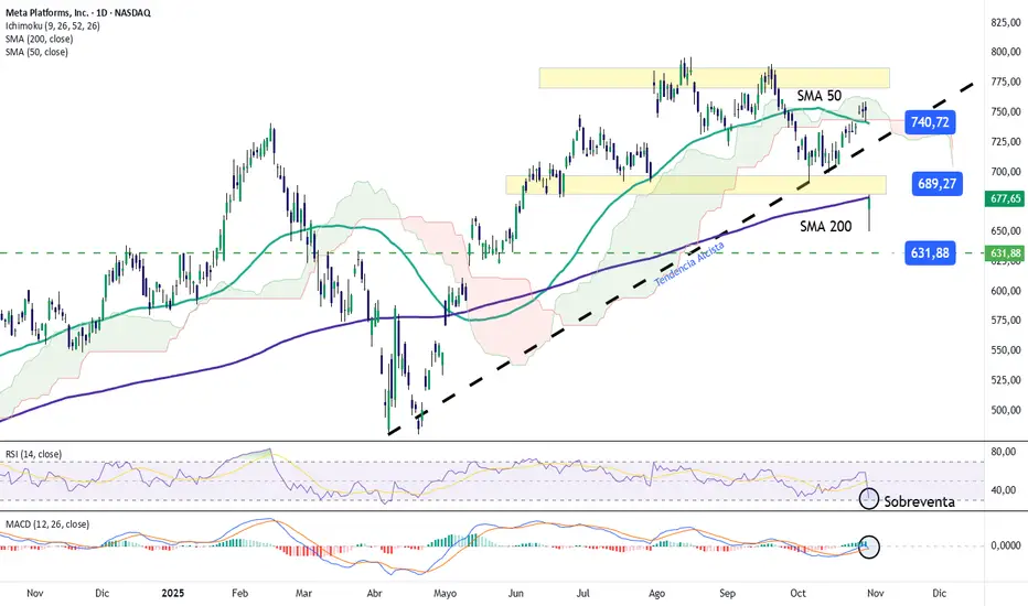 El movimiento posterior a la publicación de resultados provocó la ruptura de la línea de tendencia alcista que se mantenía desde abril del presente año, lo que podría marcar un cambio estructural relevante en el gráfico, con un nuevo sesgo vendedor dominante tras la fuerte caída.
