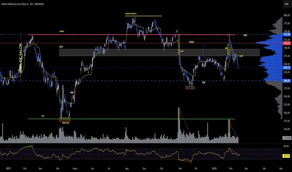 • META, en cambio, está dentro de un Área de Valor consolidada. El precio está viajando hacia el VAL (Value Area Low) en los 598-600 USD.
