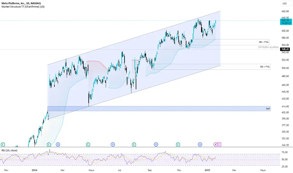 Tendencia Ascendente y Canal: Desde enero de 2024, Meta Platforms, Inc. ha mostrado una clara tendencia ascendente, con el precio moviéndose dentro de un canal ascendente bien definido. Este comportamiento sugiere que los compradores han mantenido el control, empujando el precio hacia arriba de manera consistente.