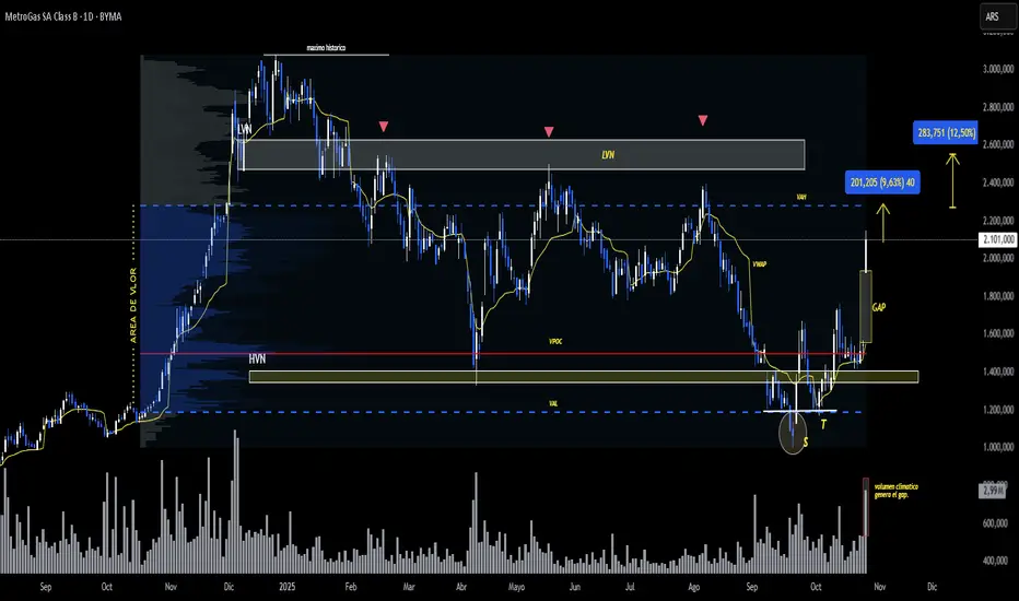 El precio reaccionó con fuerza desde la zona de valor inferior (VAL), con un impulso que generó un gap alcista acompañado de volumen creciente, señal de demanda institucional ingresando nuevamente al papel.