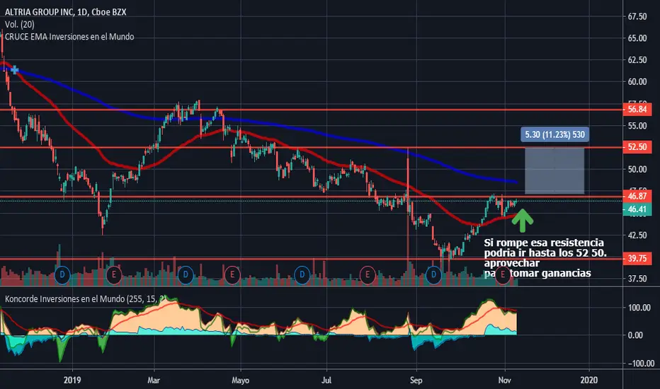 Si rompe resistencia podríamos abrir posición para tomar un 11% de ganancias hasta los 52.50. Si esto se da, podríamos estar ente la presencia de un cruce dorado en el futuro.