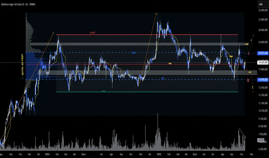 • El escenario más probable es un testeo hacia VAH (20.5M–21M) y, de superarlo, proyección al creek (24M ARS).