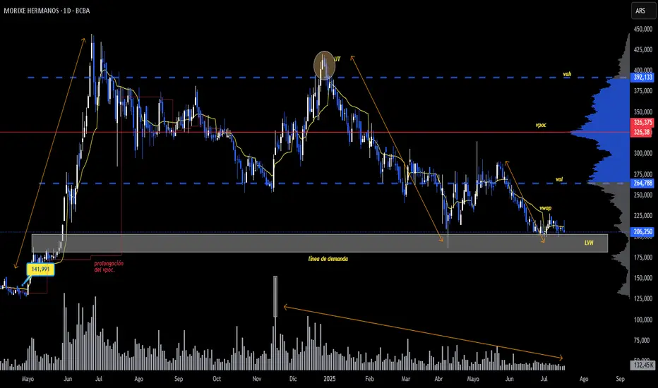 Luego del fuerte impulso registrado en abril de 2024, el precio de MORI ingresó en una fase de lateralización, consolidándose dentro del área de valor del perfil de volumen. Este comportamiento es consistente con un mercado en equilibrio tras una expansión de rango, donde la oferta y la demanda buscan una nueva zona de consenso.