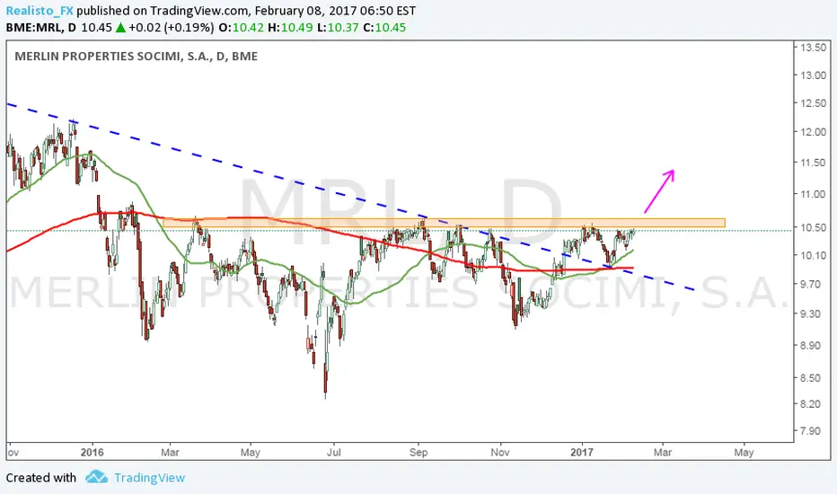 Merlin Properties está consolidando por encima de los 10 Euros y de la media móvil de 200 sesiones diarias. Con posibilidades de ruptura alcista.