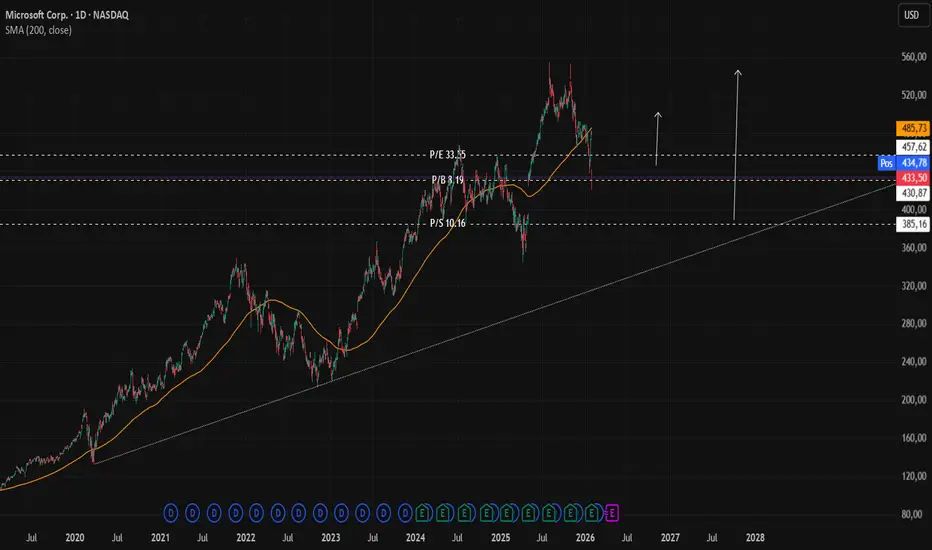 La empresa cuenta con métricas y ratios sólidos en crecimiento, rentabilidad, liquidez, solvencia, proyecciones y valuaciones. Tras la caída posterior a su último reporte, Microsoft se encuentra en zonas clave de valoración: Price To Earnings por debajo de su promedio de la última década de 33.55 con valor de 457.62 USD, Price To Book por debajo del mínimo quincenal de 8.19 con valor de 430.87 USD y Price To Sells acercándose al promedio de la última década de 10.16 con valor de 385.16 USD.
