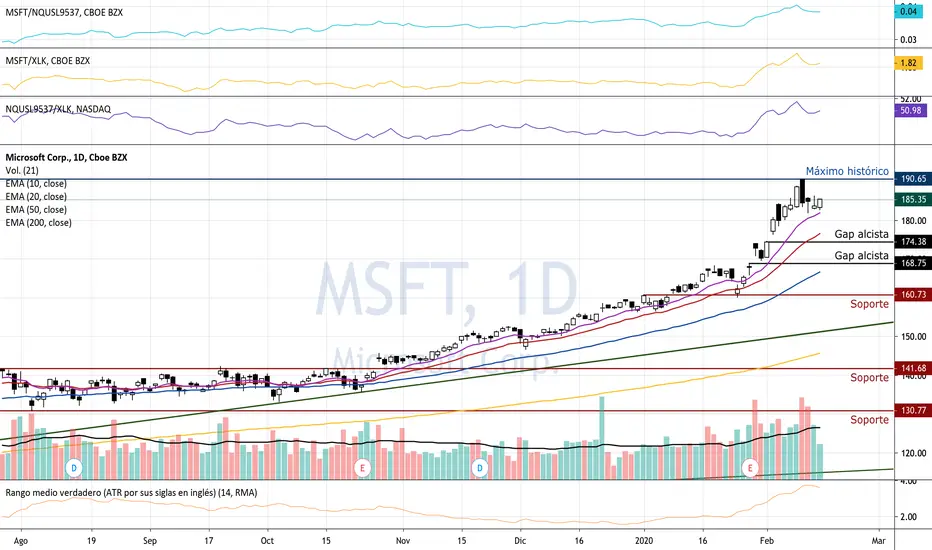 Microsoft continúa siendo parte de nuestro portafolio. Tenemos varios puntos de control para proteger ganancias acumuladas. Los primeros están identificados por los dos gaps alcistas que se ha dejado abiertos el precio en este reciente impulso, coincidentes con las EMAs de 20 y 50 días. Cualquier retroceso ha estos niveles podrían evaluarse para aumentar posiciones, si llegase a sostenerse sobre los mismos.