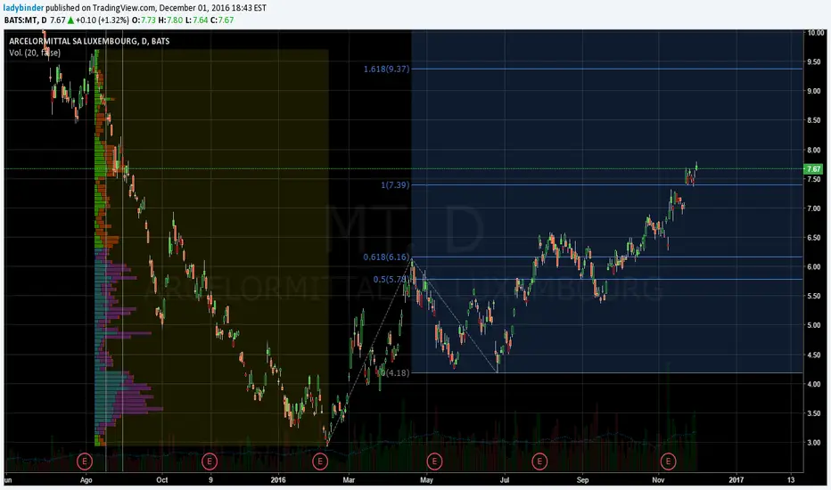 MT en zona critica, habiendo sobrepasado el objetivo de 100% de extension de Fibonacci con un gap, que ahora actua de soporte. El volumen por precio indica que al mismo tiempo se encuentra en una zona de resistencia de volumen