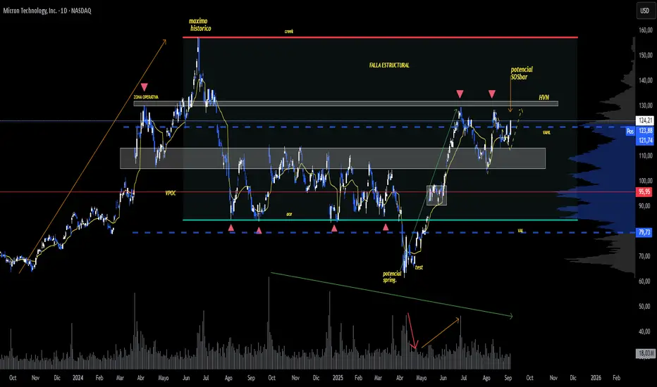 • Tras alcanzar su máximo histórico, el precio de MU desarrolla una estructura de rango claramente identificable, limitada por el creek en la parte superior y el ace como soporte estructural.