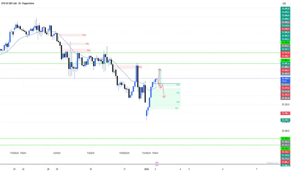 Gestión: viernes/inicio de año → proteger rápido. Si rebota a 25,450, mover SL a BE.