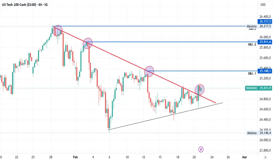 1 OBJETIVO ALCANZADO. Debería hacer una pausa en niveles de 25350 para un impulso alcista buscando un segundo objetivo en niveles de 25900. Veremos como se comporta el mercado en las próximas horas/días.