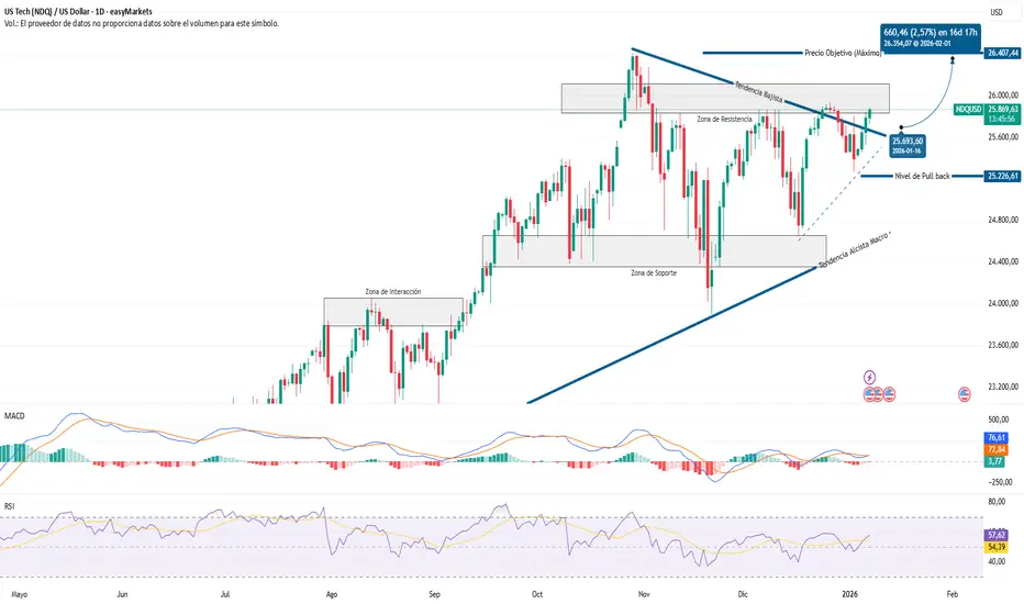 📖 Indicadores técnicos como el RSI se han mantenido cerca de niveles neutrales, alrededor de 57.00, lo que puede interpretarse como una confluencia adicional para quienes buscan oportunidades alcistas sin condiciones extremas de sobrecompra. En términos generales, el índice muestra una predisposición clara para intentar una extensión hacia nuevos máximos. Sin embargo, la posibilidad de un pull back asociado a toma de liquidez sigue presente. En caso de materializarse, el comportamiento del precio en ese nivel de retroceso será clave, ya que un pull back ordenado y sostenido actuaría como señal de fortaleza estructural para la continuación de la tendencia.