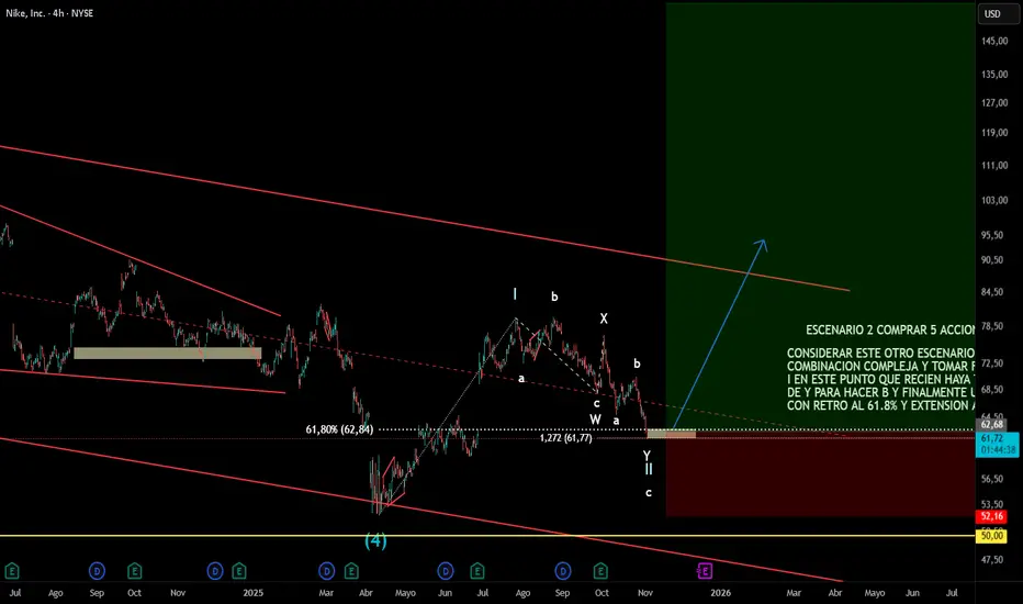 Si nike en los proximos días cae por debajo de los 52.28 nos invalidaria el escenario y tendriamos que esperar nuevamente un patron alcista para que al fin se recupere despues de estar cayendo desde 2021.