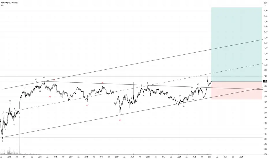 Nokia ha salido de un gran triángulo que se inició hace 14 años. Desde el punto de vista del análisis de Ondas podría haber formado una primera onda diagonal o esos tres impulso que presenta podrían corresponder a la primera onda de impulsos en distintos fractales. El desarrollo del precio nos ira despejando las dudas.