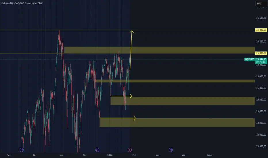 *Zona de INVALIDACIÓN (Stop Run): Si los resultados decepcionan y perdemos los 25.300 con volumen, la tesis alcista se cancela. Ese es nuestro "suelo de cristal".