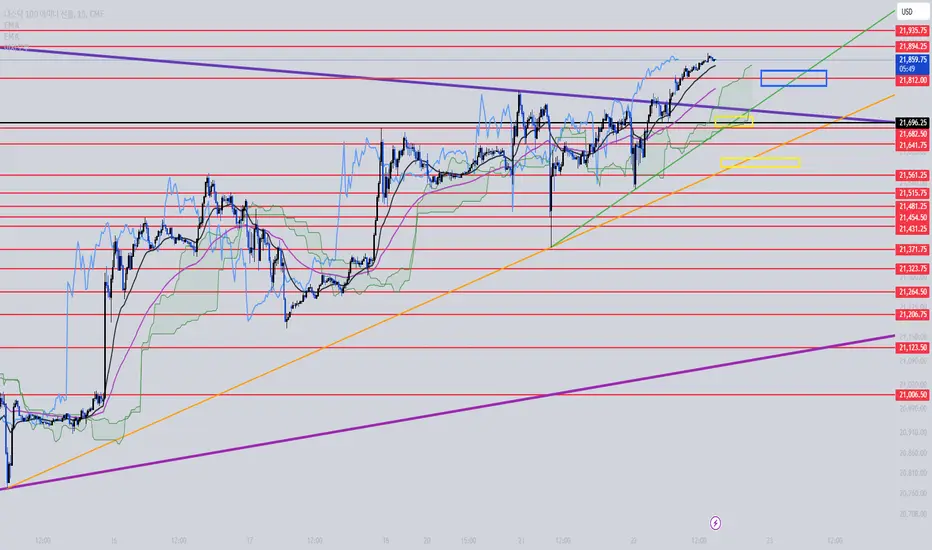 매도 관점: 21696.25 하방 이탈 또는 주황 상승 추세선 이탈이 확인될 경우 매도 진입을 고려할 수 있습니다.