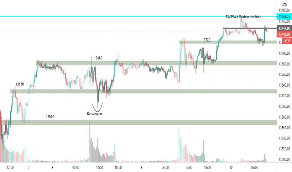 Máximo histórico en overnight, hasta el momento no se sabe hasta que nivel el precio podría llegar, si observamos en un grafico de 1H se logra ver una sobre extensión del movimiento alcista de precio, lo cual puede hacer pensar en ventas, pero hasta el momento el precio ha ido reconociendo y respetando los niveles de soporte trazados, para la sesión de hoy podríamos tener una continuación alcista sobre la zona de 13747 con proyección hasta el máximo, y si la demanda sigue acompañando la fortaleza del movimiento hasta el siguiente nivel de resistencia psicológico 13800, de igual manera podría hacer un engaño en búsqueda de liquidez, el cual se podría aprovechar en corto por debajo de los 13720 con proyecciones de movimiento hasta los siguientes soportes relevantes.