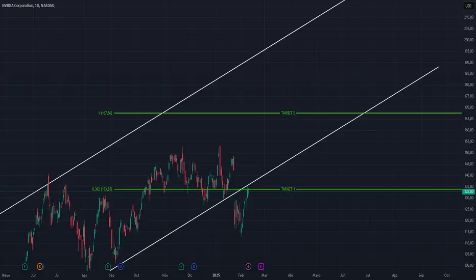 El gráfico de NVIDIA se mantiene alcista. el canal de tendencia confirma la fuerza del movimiento, Fibo marcando target 1 ya cumplido. Ahora, el target 2 se encuentra en 167.56, lo que generaría un potencial alza del 25%. La activación de este target dependerá de que el precio logre reinsertarse nuevamente en el canal alcista, señal clara de continuación.