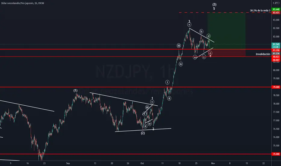 Nos vamos con la oleada alcista que existe en este momento, el riesgo beneficio es excelente, si llega en la zona del 81.250 seria ideal una compra, si rompe la onda c si invalida el patrón de triangulo y prácticamente solo perdemos 40 pips, si va a nuestro favor nos vamos por más de 200 pips que es el 38.2% de la onda 3.