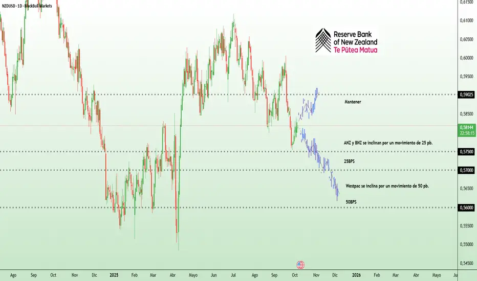 Dado que se trata del escenario base, es posible que los mercados solo vean una modesta presión a la baja sobre el NZD/USD. El par podría descender hacia 0,5750 y, potencialmente, hacia 0,5700 si el Banco da señales de una mayor flexibilización en el futuro.
