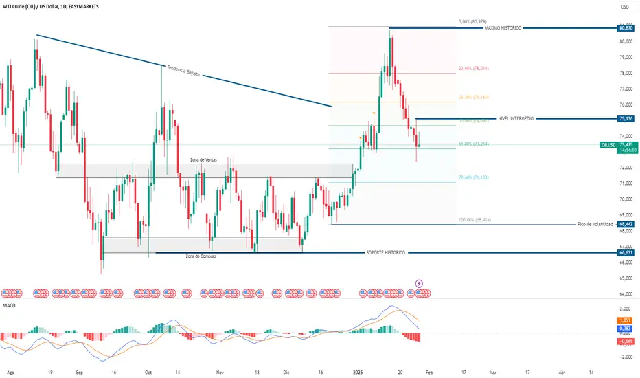 📉 La semana pasada, el Petróleo tomó una tendencia claramente bajista gracias a las presiones de la nueva presidencia de Estados Unidos, hoy se espera que finalmente encuentre soporte en uno de sus niveles históricamente más importantes, la zona de ventas. Los precios deberán de lateralizar por encima del nivel $71 , al menos por un par de días para confirmar la presión de los compradores.