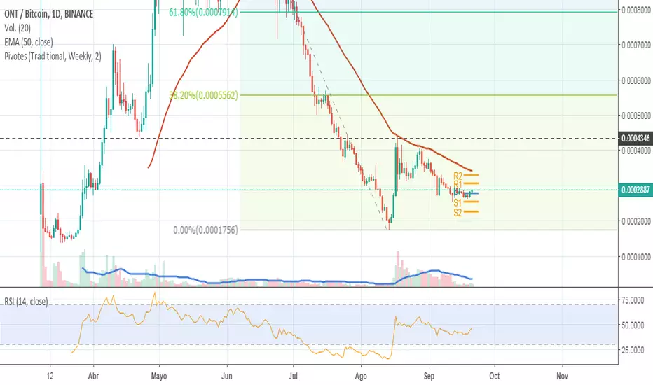 Ontology busca consolidar el punto pivote, para abrirse paso a buscar un objetivo en la zona cercana a los 35k satoshis, si se gana esta posición sería un buen punto de entrada para mediano plazo y tomar beneficio.