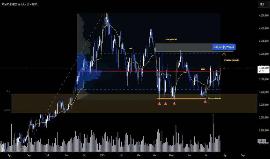 El breakout del VPOC con soporte en el VWAP, impulsado por una mejora en la calificación crediticia, refuerza la tesis de reanudación de la tendencia alcista en Pampa Energía. El próximo punto técnico a monitorear es el VAH, donde será clave observar la respuesta del volumen y la intención de la demanda.