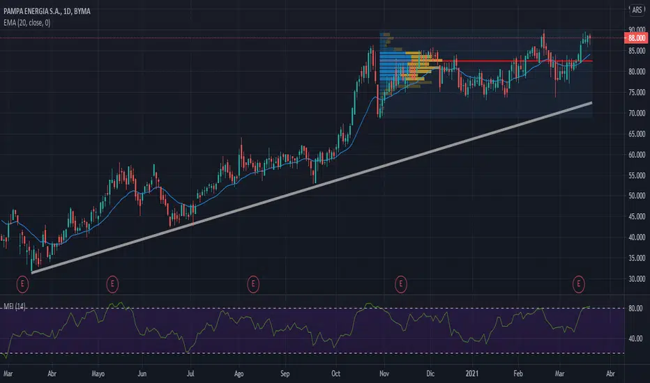 En el caso de manifestarse una toma de ganancias , tiene una zona de soporte dada por el perfil de volumen, alrededor de los 82 pesos.