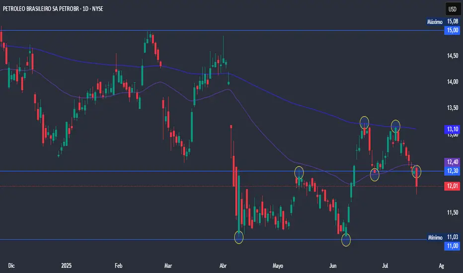 Petrobras llegó a caer hasta la zona del 12,00 y de confirmar una ruptura real por debajo de ese nivel, la próxima zona de soporte más relevante para la acción podría estar en el mínimo del 11,00 y el nivel del 12,30, podría cambiar de función de nuevo a resistencia.