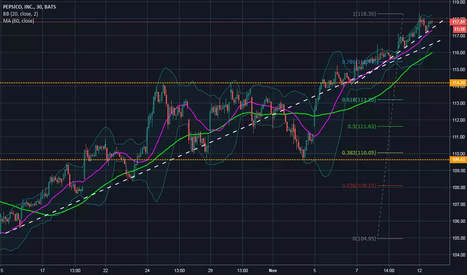 PEP encontrándose a 0.58% de resistencia del día 23-01-2018. De superar dicha resistencia el próximo nivel a alcanzar se ubica a una distancia porcentual de 3.48% en 122.51. Niveles del ATR sugieren recorridos del precio entre 0.40 y 0.60 en el horizonte de un mes. Alineación actual de indicadores se encuentran a una distancia porcentual de 0.36% de la banda superior de Fibonacci en 118.30