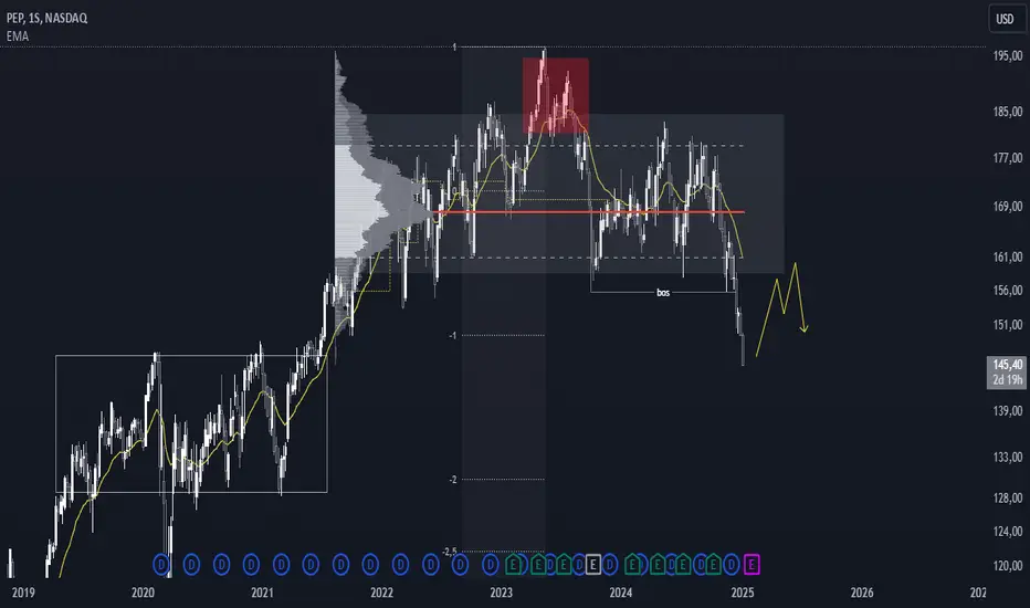 Hola gente, hablemos de PepsiCo que esta cayendo su precio y esta cayendo fuerte. Podemos visualizar en la grafica de W1 una consolidación de largo plazo que estaría entrando en una etapa de extensión del precio. ¿Distribución confirmada?, para confirmar ello el precio no debería poder reingresar al rango. De manera que si confirma una distribución de largo plazo el precio podría atacar zonas mas bajas incluso.