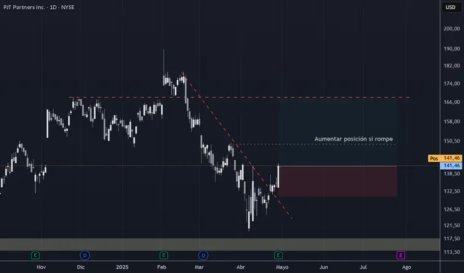 Actualmente, el precio ha roto la directriz bajista de corto plazo (línea punteada roja) y se encuentra enfrentando una zona clave: la confluencia de la media de 200 sesiones (línea roja gruesa) y la media de 50 sesiones (línea gris). Esta área suele actuar como resistencia dinámica importante.