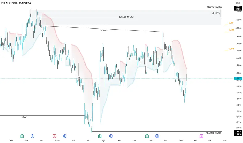Zona de interés OB+FVG: En niveles superiores, se identifica una caja de interés OB+FVG , alineada con los retrocesos de Fibonacci (0,618 - 0,85). Esta área es crítica para observar posibles rechazos o una acumulación previa a continuar al alza.