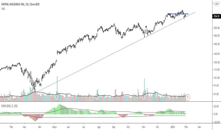 Paypal cierrra la semana contra la línea de tendencia alcista que se inicia en el mínimo del año pasado. Debe superar los 243-245 dólares para volver a los máximos históricos. Abajo el nivel de control está en 225, porque de perderlo el siguiente soporte está en los 200 dólares.