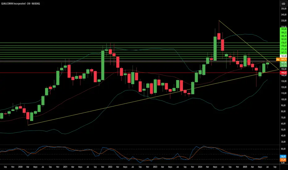La extensa cartera de patentes de Qualcomm, con más de 160,000 patentes, constituye una importante barrera competitiva. Su programa de licencias de Patentes Esenciales Estándar (SEP, por sus siglas en inglés) genera corrientes de ingresos sustanciales y consolida su influencia en los estándares inalámbricos globales, desde 3G hasta 5G y más allá. Este liderazgo en propiedad intelectual, junto con una estrategia consciente para reducir la dependencia histórica de clientes como Apple, permite a Qualcomm abrir nuevas corrientes de ingresos. La empresa se ha fijado como meta alcanzar un equilibrio del 50% entre ingresos móviles y no móviles para 2029. Esta expansión estratégica, sumada a su compromiso con el pago de dividendos, refuerza una visión de crecimiento a largo plazo para este gigante de los semiconductores.