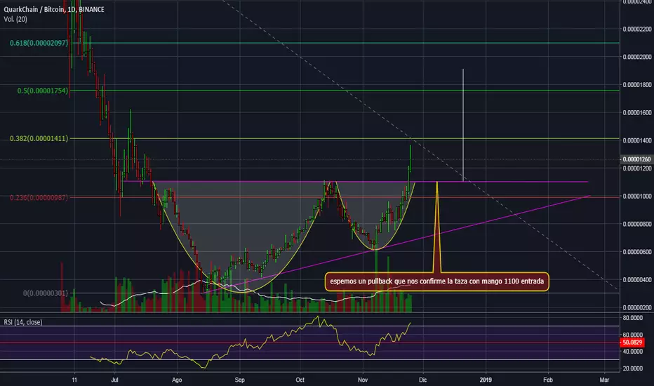 una muy linda oportunidad en QKC/BTC luego de ser listada en binance vemos un claro dump , pero al encontrar soporte ya tenemos un 400 % y hoy se esta dando la ruptura de la formacion taza con mango un clara señal de cambio de tendencia estaremos esperando un pullback para buscar como objetivo principal el 0.61 fibo nivel técnico siguiente