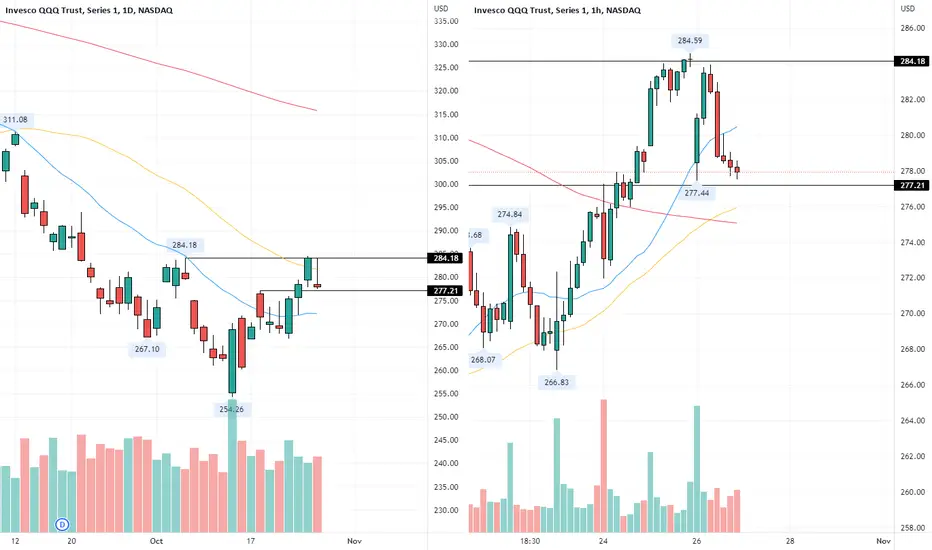 La segunda lectura, si bajo al gráfico horario, es que el precio está enganchado dentro de un movimiento lateral justo en zona de soporte del punto pivote relevante anterior de 277.21 (los 277.44 pertenecen a ayer).