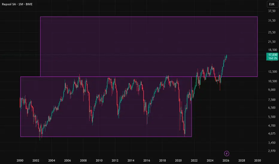 Repsol desarrolló entre 2020 y 2021 una secuencia de precios (exdividendo) comprendida entre 4 y 11,50 euros. Tras romper la resistencia de los 11,50 euros y realizar el correspondiente throwback, parece estar replicando esa misma estructura, con una posible proyección hacia los 35 euros en el medio-largo plazo.