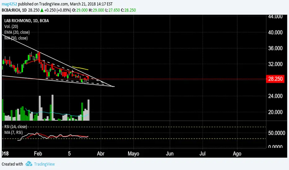 Todo me hace pensar que estamos en presencia de una cuña de resolución alcista. El papel, tiene poca historia (y poco volumen pactado también) como para saber que tanto puede llegar a respetar formaciones de figuras técnicas, aunque para ello debe primero superar la EMA20 y la dinámica de la propia cuña. En estos últimos días hemos visto incremento de volumen, lo que podría prenunciar una posible e incipiente zona de acumulación. El RSI, en el orden de 38, se esta virando hacia arriba. Es esperar entonces para ver que pasa con el papel por encima de 29, para despejar la icognita. Una alarma no vendría mal para estar atentos. Estos papeles, de poco volumen y poca historia, suelen tener movimientos violentos (En uno y otro sentido).